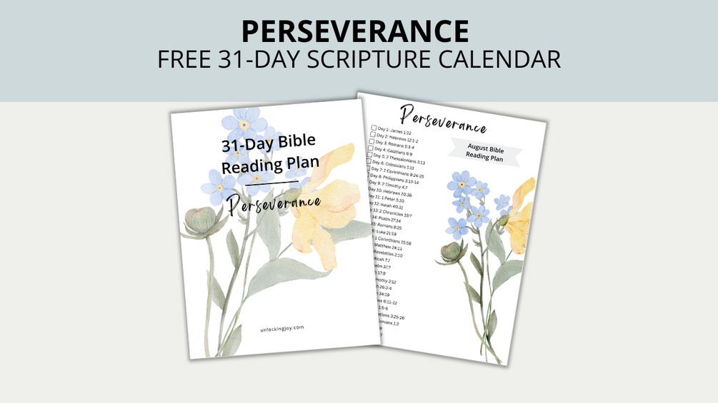 Find encouragement to keep going with this Perseverance Bible reading plan. This printable calendar includes 31 daily scriptures to remind you that even in seasons of exhaustion and heartache, God gives you the strength to endure. Each verse will help you take one faithful step at a time, trusting that He walks beside you through it all.
